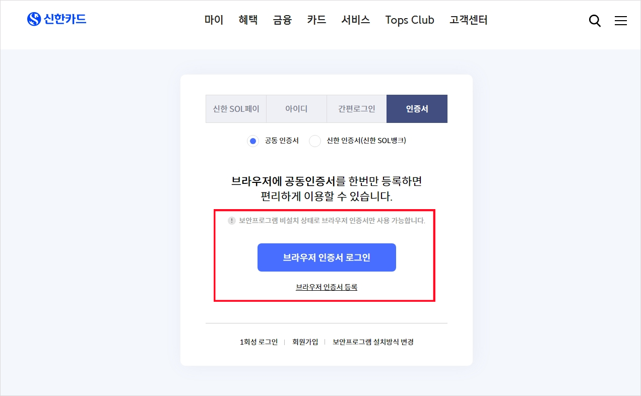 로그인 방법은 아이디,신한SOL,간편로그인,인증서 방식으로 나눠져 있는데 저는 인증서가 있기 때문에 인증서 로그인으로 선택하였습니다. 하지만 최초 접속시에는 반드시 "인증서 등록"을 하신후에 하셔야합니다.