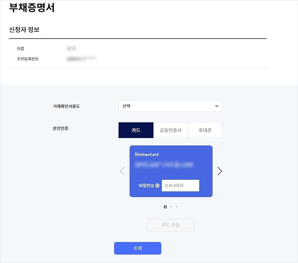 링크통하여 이동하면, 부채증명서 발급 메뉴가 나옵니다. 거래확인용도 와 발급할 카드를 선택후에 "조회"를 합니다.