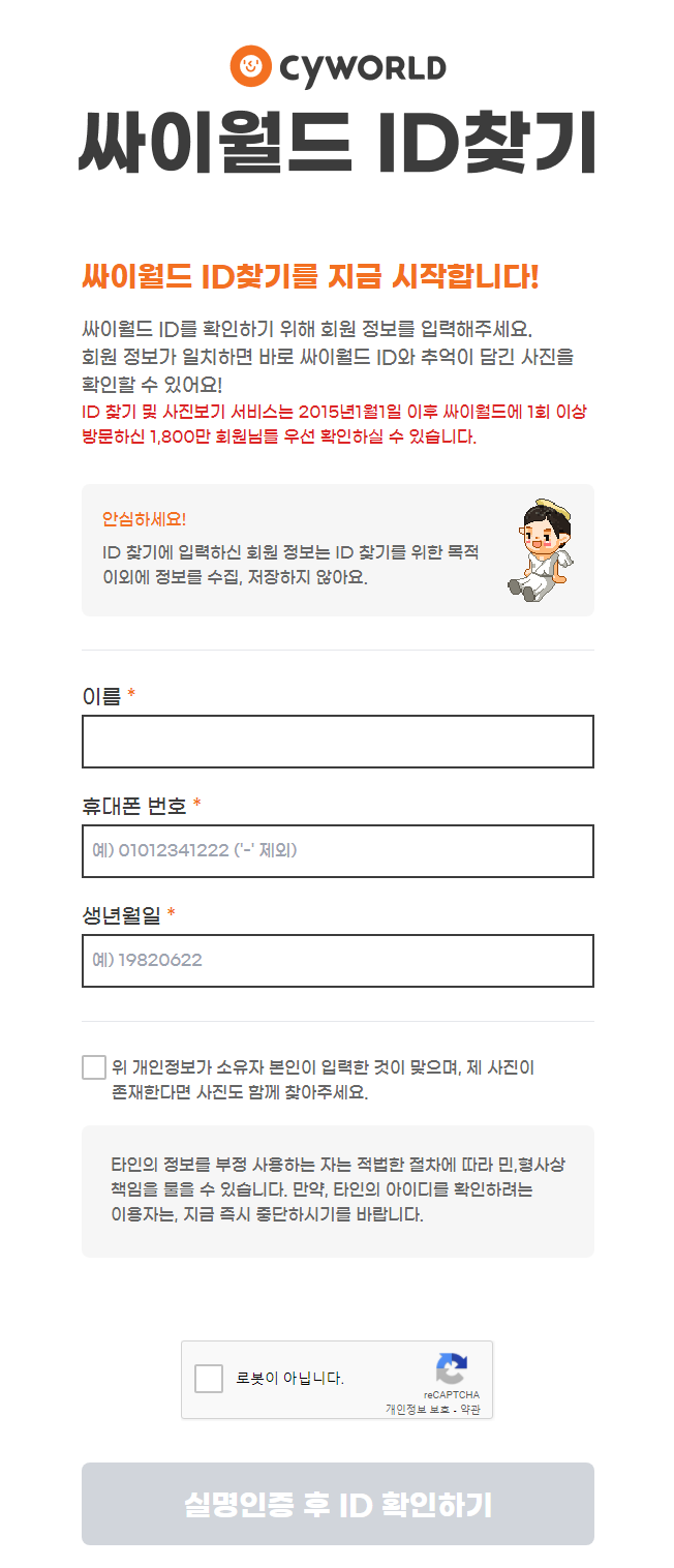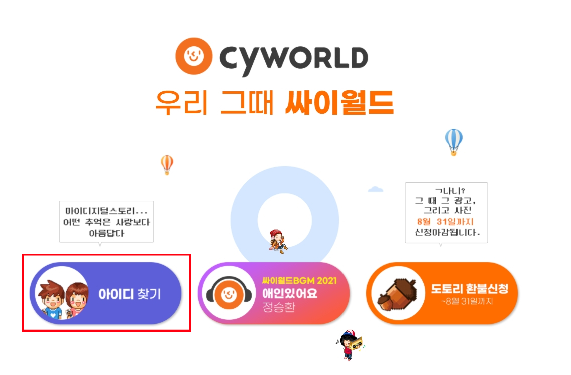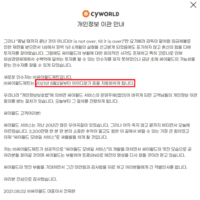싸이월드 홈페이지에들어가 "개인정보 이관 안내"문을 쭉읽어보니 어려움을 이겨내고 결국 투자자를 만나 현재 서비스 오픈까지 가게된 스토리를 알수 있었고 새로 인수한 회사인 싸이월드제트에서 8월2일부터 아이디 찾기 자동화 서비스를 시작하겠다고 안내문에 적어져있어서 저도 시도해보기로했습니다.