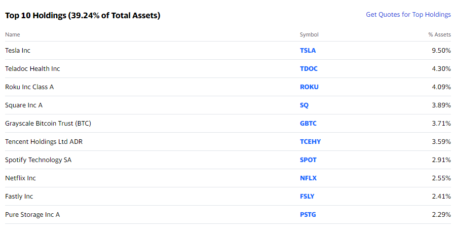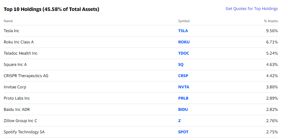 : 이 펀드의 같은경우에는 아크 인베스트먼트의 주력 ETF로 현식적인 기업 투자 하는 EFT 입니다. 현재 혁신에 선두주자라고 할스 테슬라부터 해서 전혀 다른 섹터의 기업인 질로우 까지 다양한 성장주들이 모여있습니다.