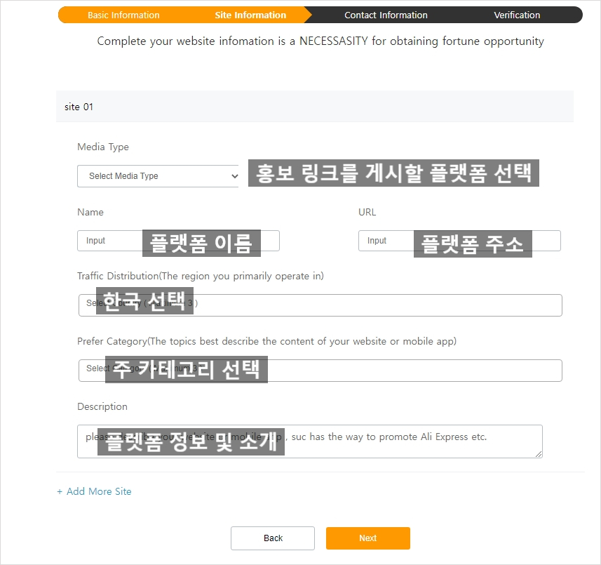 홍보할 플랫폼과 사이트 국적 주로 홍보할 카테고리 플랫폼 설명등을 입력하는 내용입니다.