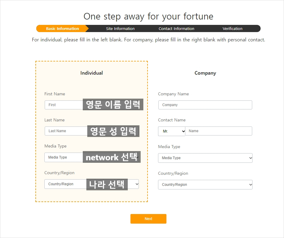 영문이름과 성 그리고 홍보 미디어 그리고 어느 나라인지 간단한 정보를 입력하시면됩니다.