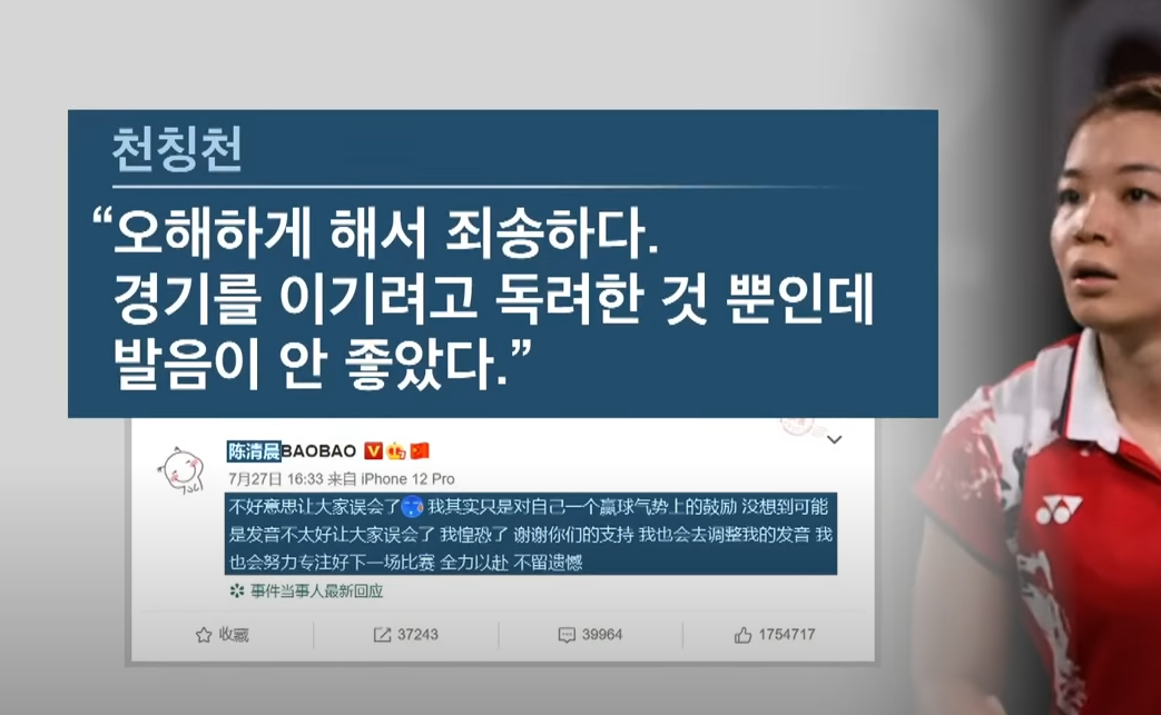 천칭천 선수는 자신의 sns에서 "오해하게 해서 죄송합니다. 경기를 이기려고 독려한 것뿐인데 발음이 안좋아싸."라는 변명의 글올렸고, 중국 네티즌들의 응원에 힘입어 그다음경기에서도 워차오 차오 욕을 했다고 합니다.