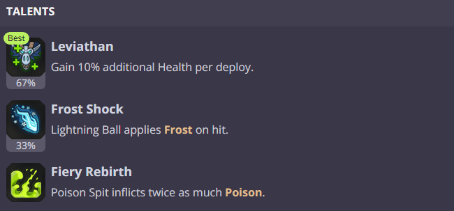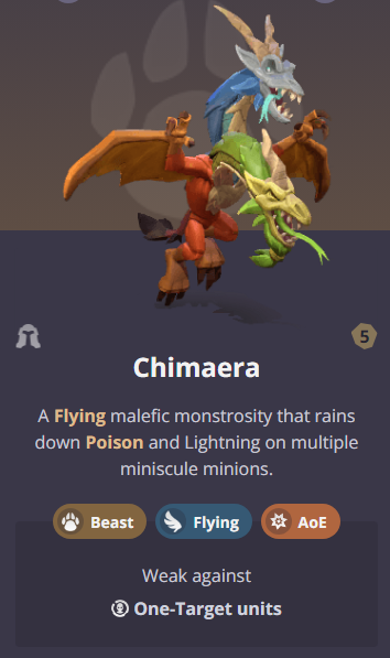 계열은 야수이고, 공중유닉이며, 원소 공격을 가지고 있고 금화 코스튼 5입니다. 외형과 비슷하게 번개 구슬과 독액을 발사합니다. 번개 구슬은 공중으로 번개 구슬 내뿜어 땅에 떠어질 때 연쇄 번개를 방출해 여러 적에게 피해를 줍니다. 독액은 공중으로 독을 발사해 떨어 저질 때 범위 내의 여러 적에게 광역피해를 입힙니다.