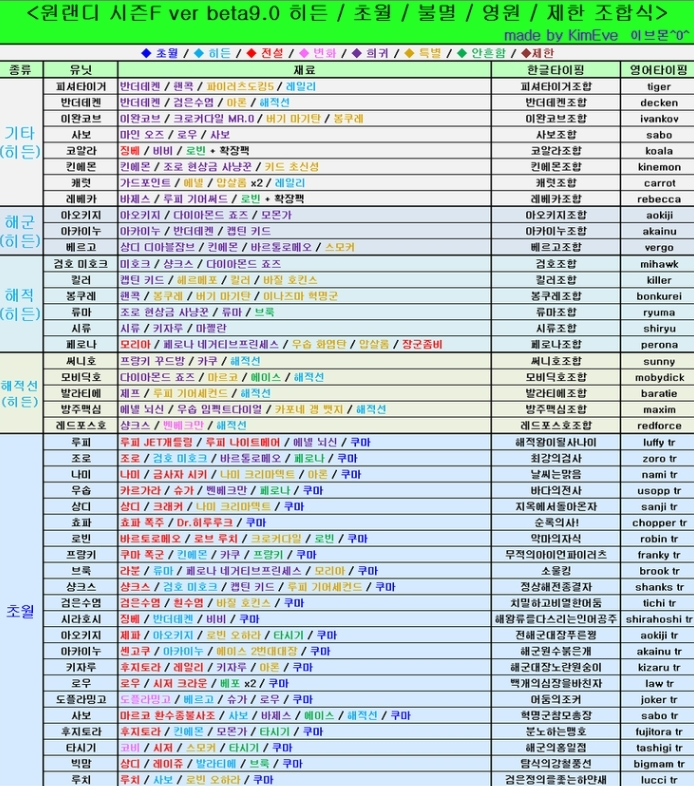 <원랜디 9.0 히든조합 정리표>