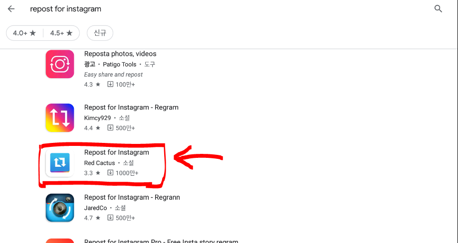 일단 구글 플레이스토어나, 애플스토어에 "repost fo instagram"을 검색합니다