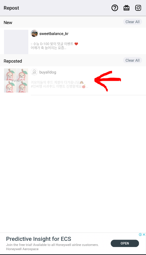 완료하고 리그램을 다시 키면 "reposted"에 리그램할 게시물이 떠있습니다.