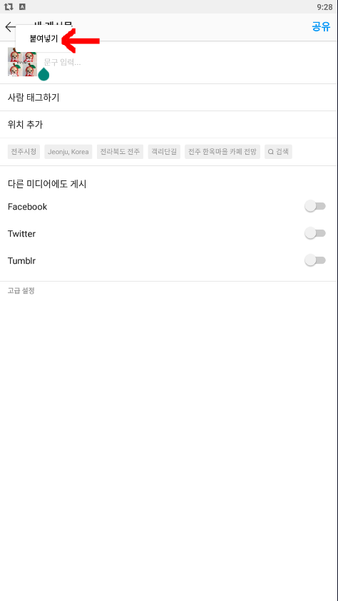 이미지는 그대로 하기 위해 다음 터치하고, 해당 게시물에 글을 작상할 차례가 나오는데, 여기서 그냥 붙여 넣기만하시면 끄읏~납니다!!