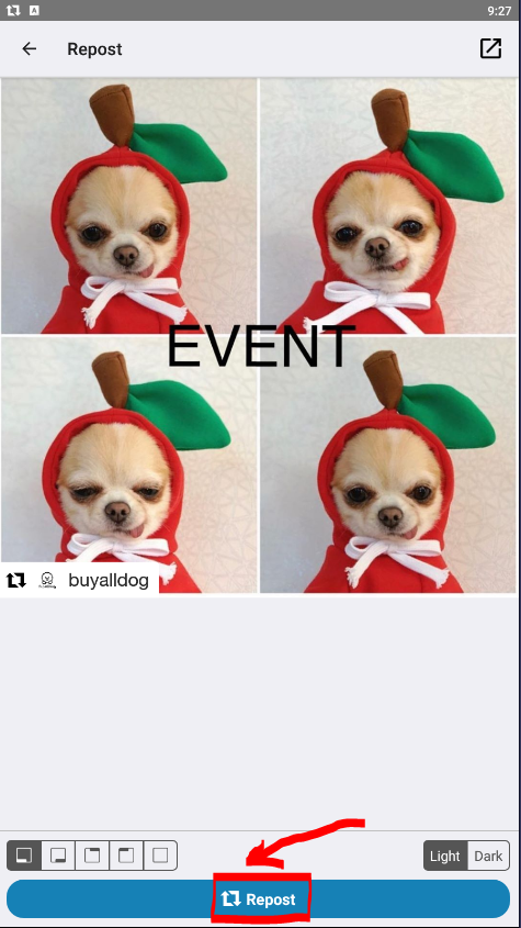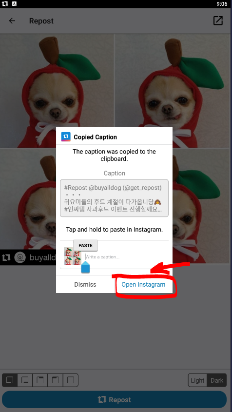 맨 하단에 "repost"를 터치 하시면 영문으로 어떻게 리그램하는지 간단한 설명이 나옵니다.