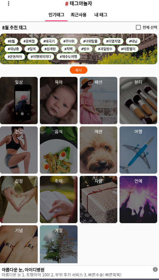 인스타그램 해시태그 모음 어플에 이름은 "태그쉽게, 인기해시태그#태그야노놀자" 입니다