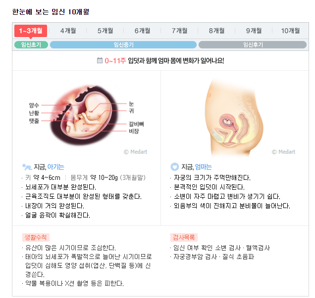 클릭하면 3개월증상에 대해서 자세하게 나옵니다. 아이가 얼마나 컸는디 현재 엄마 증상은 어떤지 그리고 해야할 검사가 먼지 이렇게 간편하게 확인할수 있네요^^