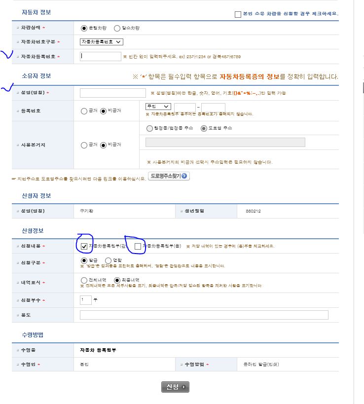 발급을 위해서는 2가지만 알면됩니다. 차량 넘버하고, 현 차량 소유주의 이름만 알면되고 나머지 정보는 없어도 무방합니다.