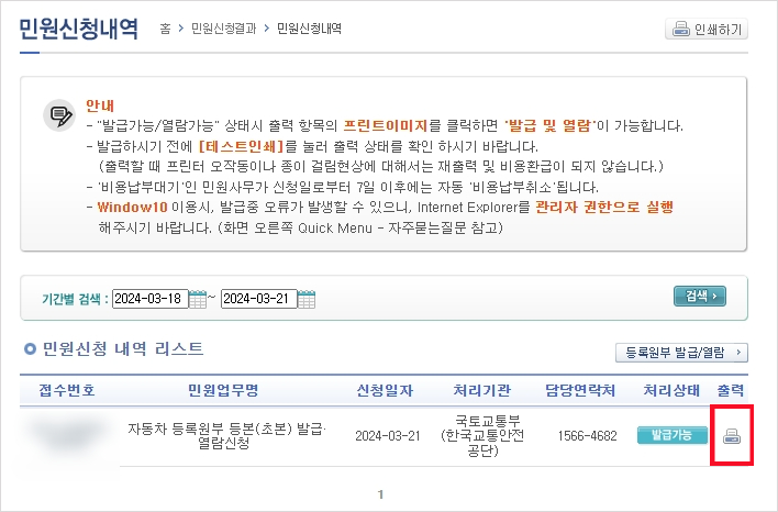 이렇게 하면 민원신청내역이 나오는데 처리상태에 발급 가능으로 나오게 되면 오른 쪽 프린트 버튼을 누르게 되면 인쇄가 가능하게 됩니다. 인터넷으로 발급할경우 5분 내외로 발급이 되기 때문에 가까운 주민센터나 자동차 등록사업소에 방문 없이 처리가 가능합니다.