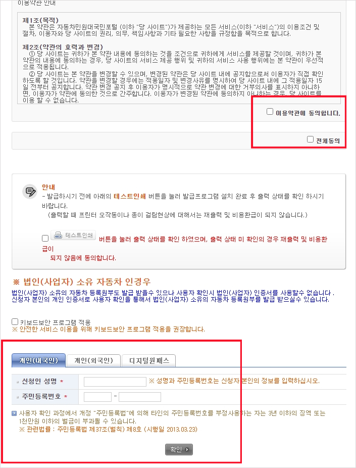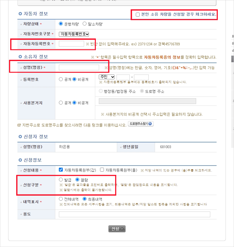 자신의 공동 인증서로 로그인 한경우 "본인 소유 차량을 신청할 경우 체크하세요"를 체크하시면 가지고 있는 차량의 번호가 바로 입력되면서 쉽게 발급할수 있습니다. 간혹 차량 구매 전에 발급하는 경우 자동차번호 와 차량 소유주 이름만 입력하면 발급이 가능합니다.