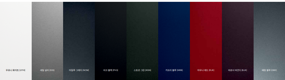 우유니 화이트 / 세빌 실버 / 마칼루 그레이 / 비크 블랙 / 스토르 그린 / 카프리 블루 / 마우나 레드 / 바로사 버건디 / 베링 블루