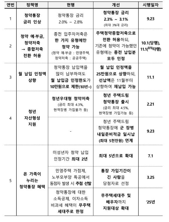 주요 내용은 "청약통장 금리 인상 , 청약 예.부금,청약저축을 주택청약종합저축 전환, 월 납입 인정액 상향"등이 주요 내용이고, 그밖에 청년 자산형성 지원, 온 가족 혜택등에 수정사항이 있으니 하나씩 정리해보도록하겠습니다.(보도자료 바로가기)