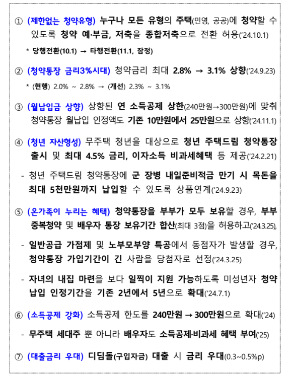 주요 내용은 "청약통장 금리 인상 , 청약 예.부금,청약저축을 주택청약종합저축 전환, 월 납입 인정액 상향"등이 주요 내용이고, 그밖에 청년 자산형성 지원, 온 가족 혜택등에 수정사항이 있으니 하나씩 정리해보도록하겠습니다.(보도자료 바로가기)