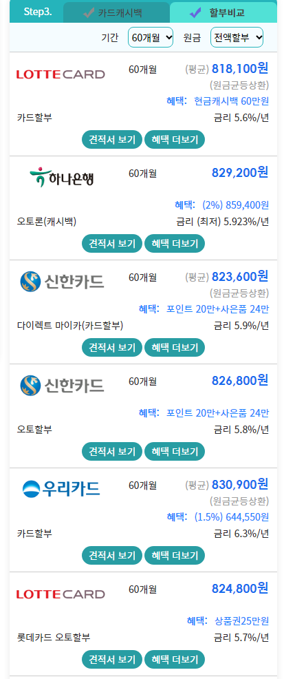 그럼 마지막 화면에 카드사별로 캐시백이 얼마나 되는지 나오는데 현재에는 롯데카드가 프로모션을 가장 많이 하는 거 같네요 그 옆 메뉴에는 할부 비교할 수 있는데 60개월 전액 할부 기준으로 조건을 맞추서 보면 한 달에 납부 금액과 금리 그리고 캐시백 금액이 나와있고, 견적 보기를 클릭하시면 한눈에 보기 좋게 견적서가 나옵니다.