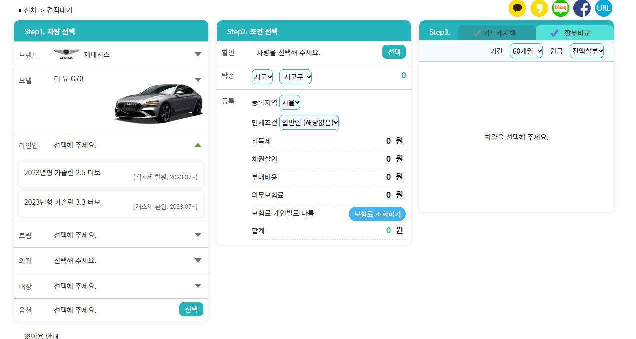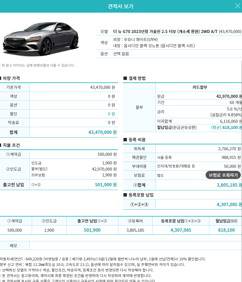 차량 구매 전에 미리 견적서 하나 뽑아서 가신다면 딜러에 말에 휘둘리지 않고 차량을 잘 선택할 수 있으니 미리 해보시는 것을 매우 추천해 드립니다.