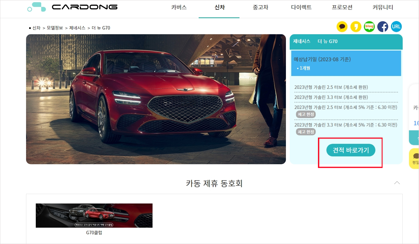 차량을 구매하기 전에 차량마다 조건이 조금씩 다를 수 있기 때문에 미리 견적을 내보는 것도 좋은데 저 같은 경우 이번에 새로 나온 G70을 생각하고 있기 때문에 먼저 견적과 할부사를 체크해 보겠습니다. 먼저 카테고리에서 신차를 클릭합니다.