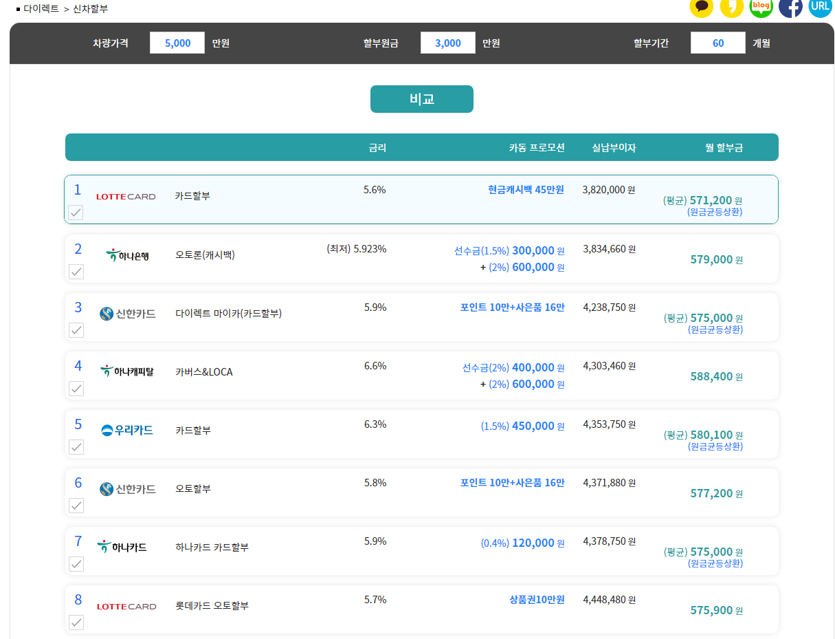 한 달에 나가는 할부금이 궁금하시다면 신차할부금 비교를 해보시면 되는데 "신차할부" 탭을 클릭하시면 확인이 가능합니다. 차량가액과 할부원금 그리고 할부 기간을 입력하시면 금리 비교를 쭉 해주고 포로모션 정보까지 확인이 가능합니다.