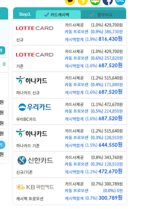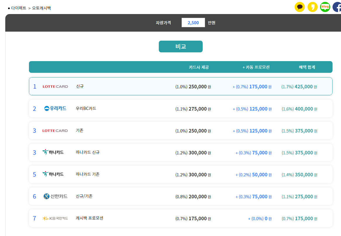 카동 메뉴 중에 다이렉트 오토캐시백 메뉴가 있습니다. 이미 다른 부분은 다 알아보셨고 차량 가격에서 캐시백이 얼마 나오는지 궁금하시다면 오토캐시백에서 차량 가액만 입력하시면, 카드사마다 캐시백 금액을 알 수 있습니다. 현재 롯데 카드 보면 약 60만 원 정도 되는데 이 금액이면 썬팅지도 한 단계 위급으로 할 수 있으니 절대 적은 금액이 아닙니다. 딜라 말대로 하지 마시고 꼭 알아보시길 바랍니다.