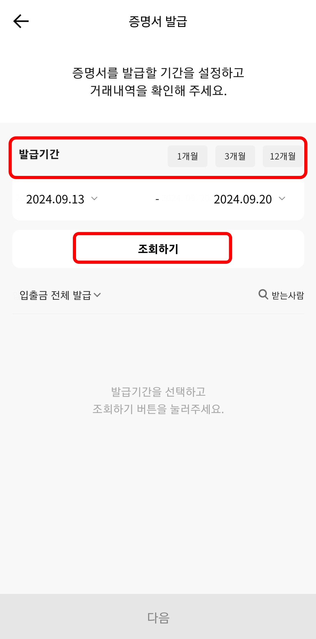 통장을 선택하고 발급 기간을 선택합니다. 최대 1년까지 가능하기 때문에 1년 이상 발급을 하실 경우에는 1년씩 기간을 나눠서 발급신청을 해야 합니다. 기간까지 모두 선택하고 조회하기 누르시면 끝!