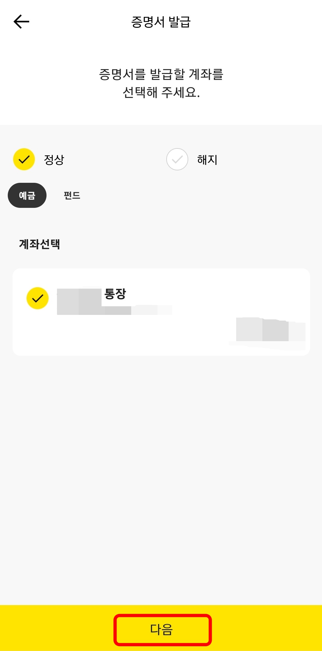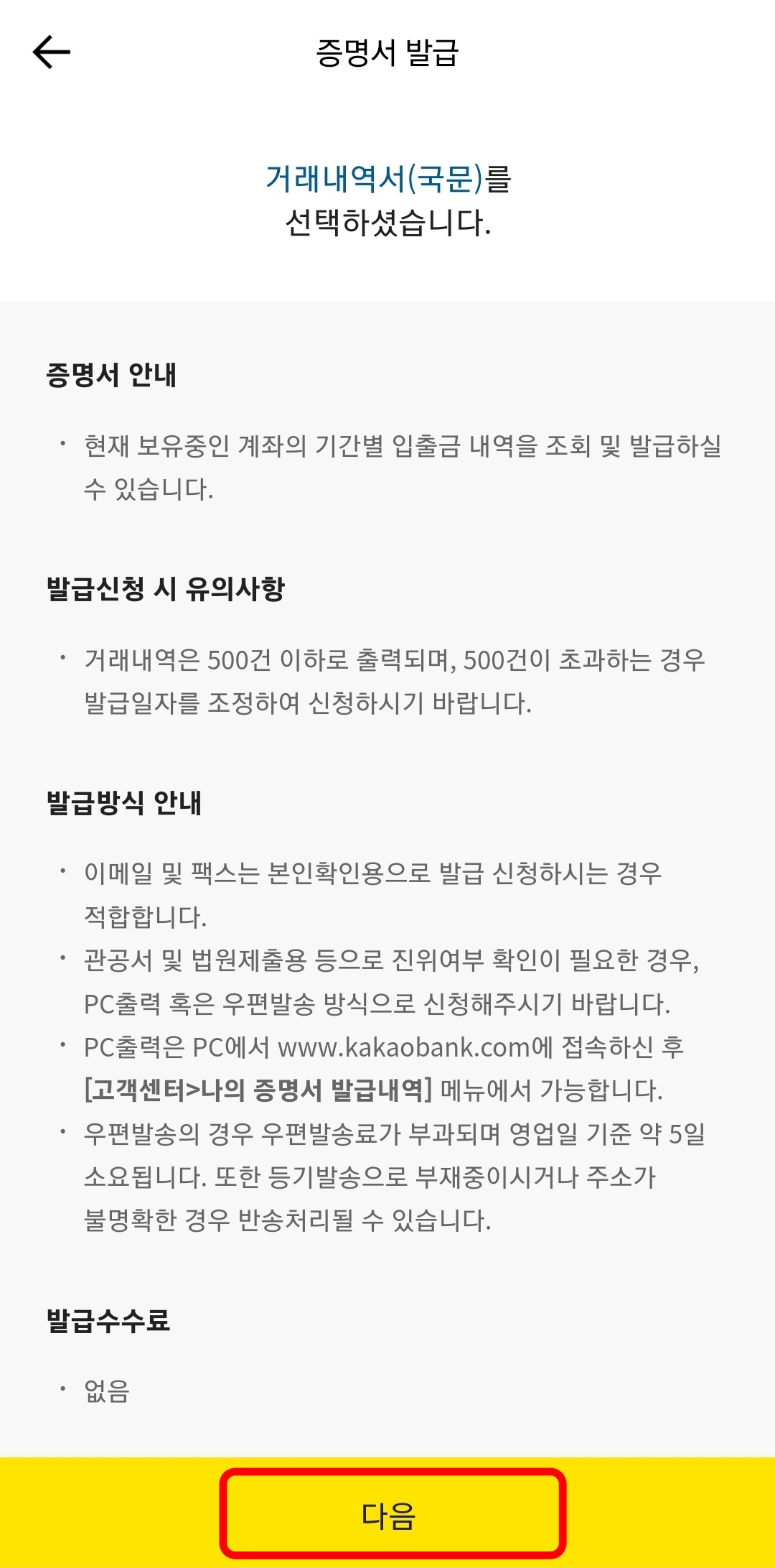 증명서 발급을 누르면 카카오뱅크 거래내역 발급이 맞는지 확인하는 화면이 나옵니다.