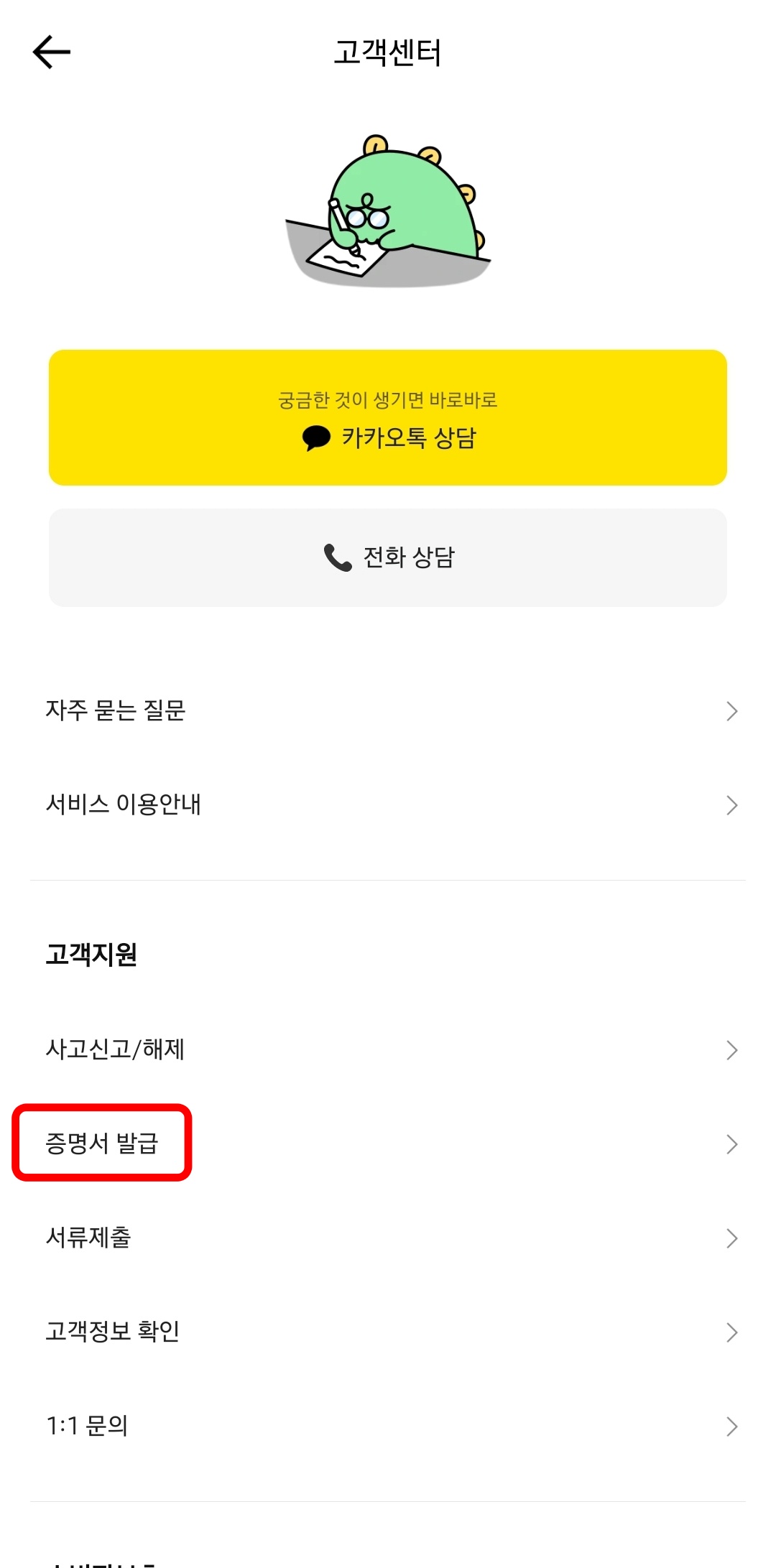 고객센터에는 카카오톡 상담, 전화상담 등 문제가 발생할 때 연결할 수 있는 메뉴가 있습니다.
