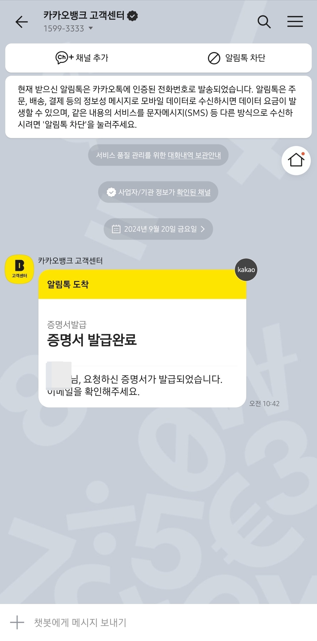발급이 완료가 되면 카카오톡 메시지를 통하여 발급이 완료 되었다는 메세지를 확인할 수 있습니다.