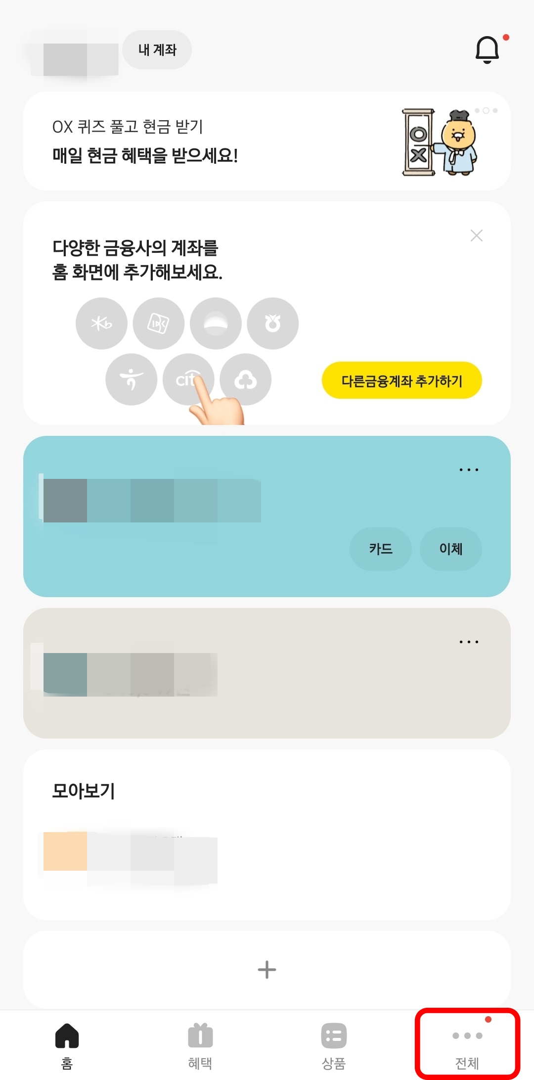 카카오뱅크 어플에 접속하셔서 오른쪽 하단에 "전체" 메뉴를 클릭해 주세요.