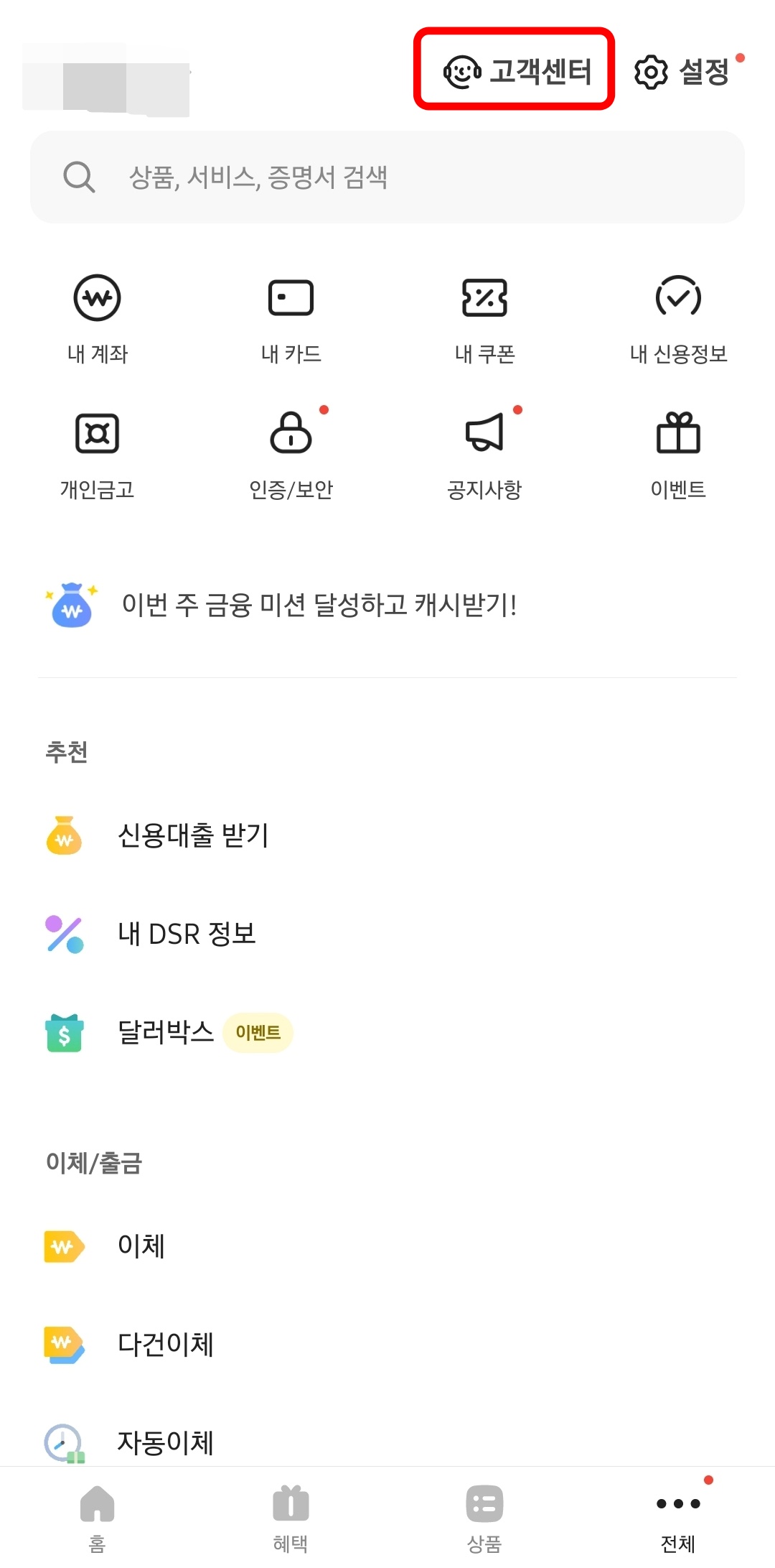 내 계좌, 내 카드, 쿠폰등 카카오뱅크에서 이용할 수 있는 다양한 서비스가 있는데 우리에게 필요한 것은 카카오뱅크 거래내역이기 때문에 "고객센터" 클릭!