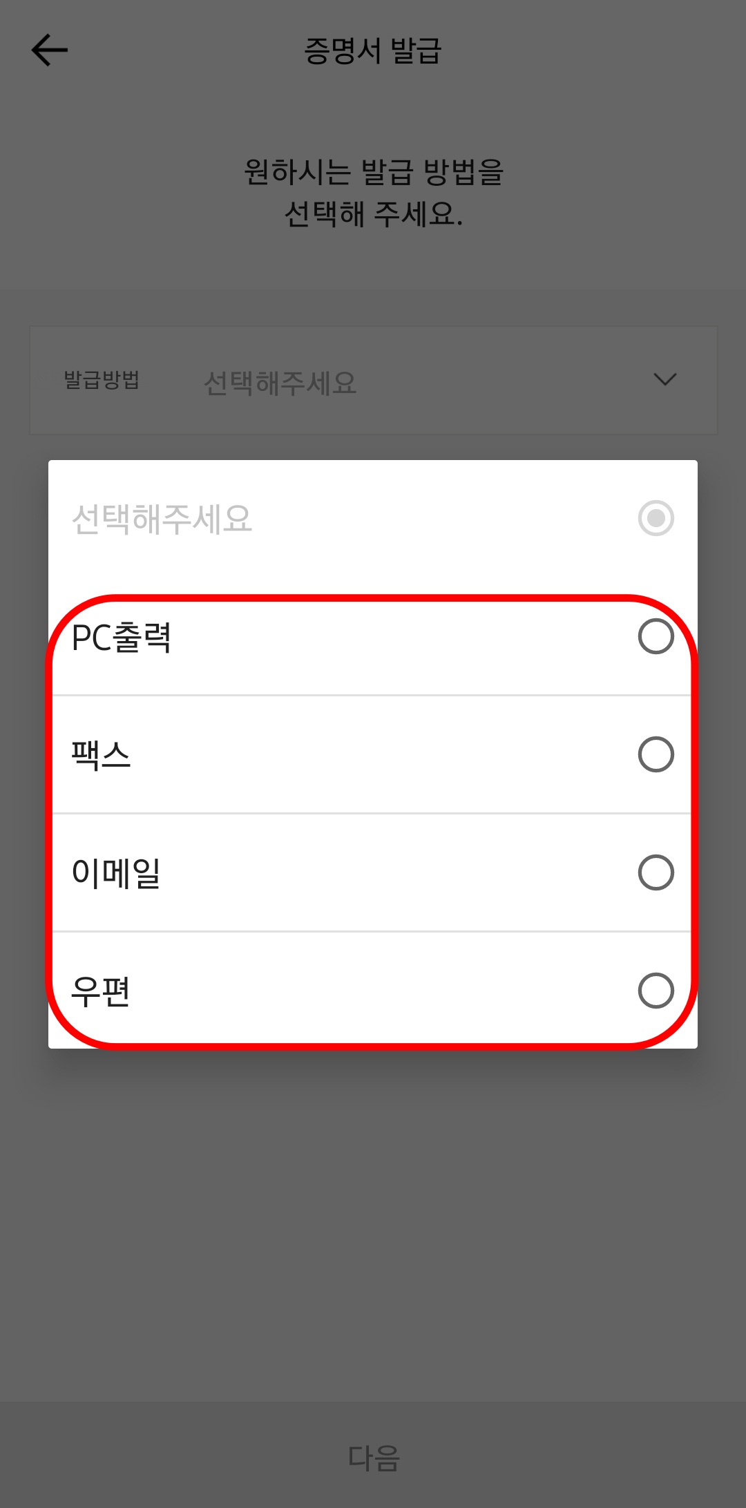 발급 방법은 "PC출력, 팩스, 이메일, 우편" 4가지 방법이 모두 가능합니다.