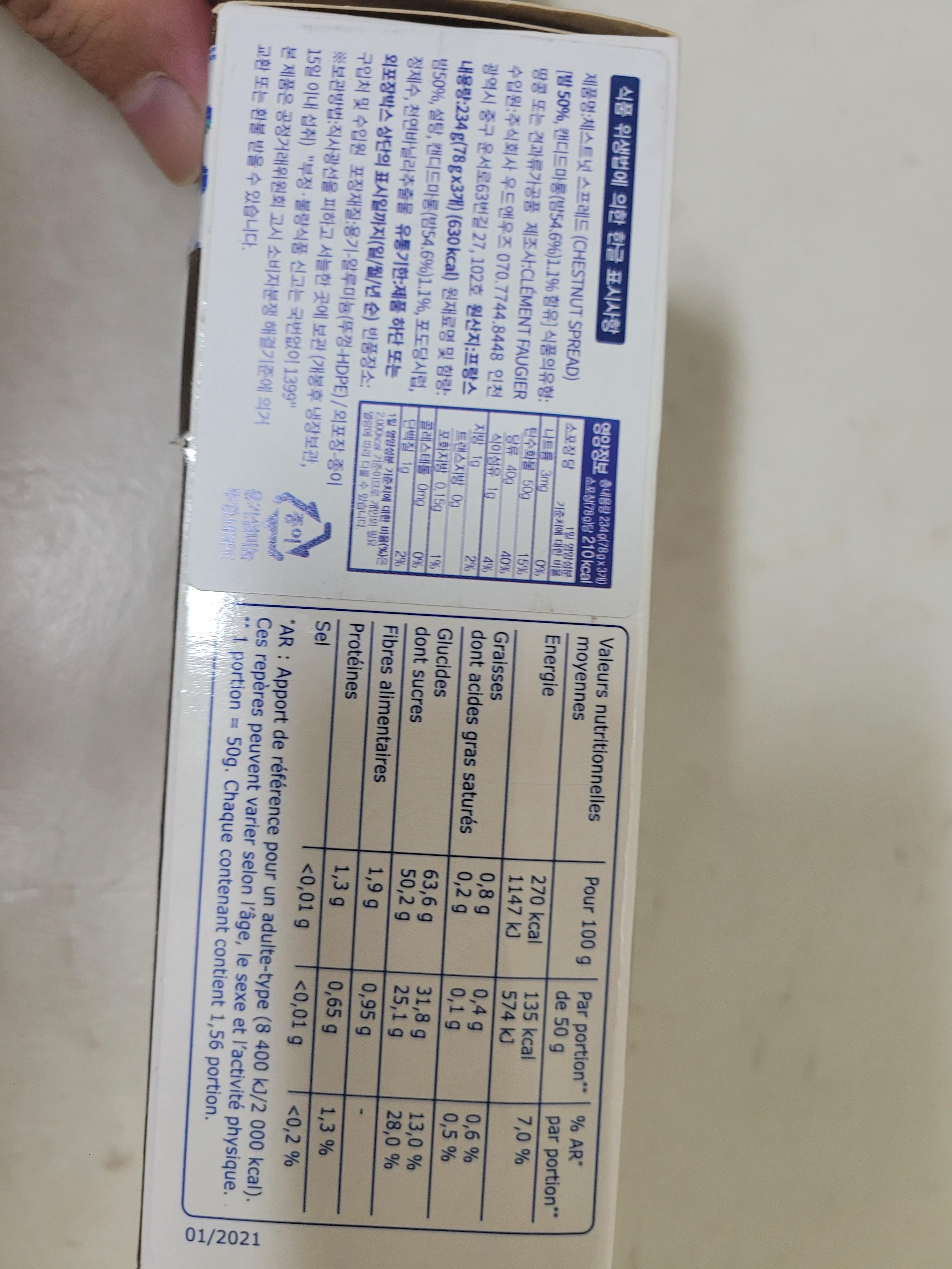 내용물은 밤 50%, 캔디드마롱 1.1%, 설탕 등이 들어있습니다. 밤 비율이 50% 이상이라는 것에 만족하며 내용물을 확인해보았습니다.