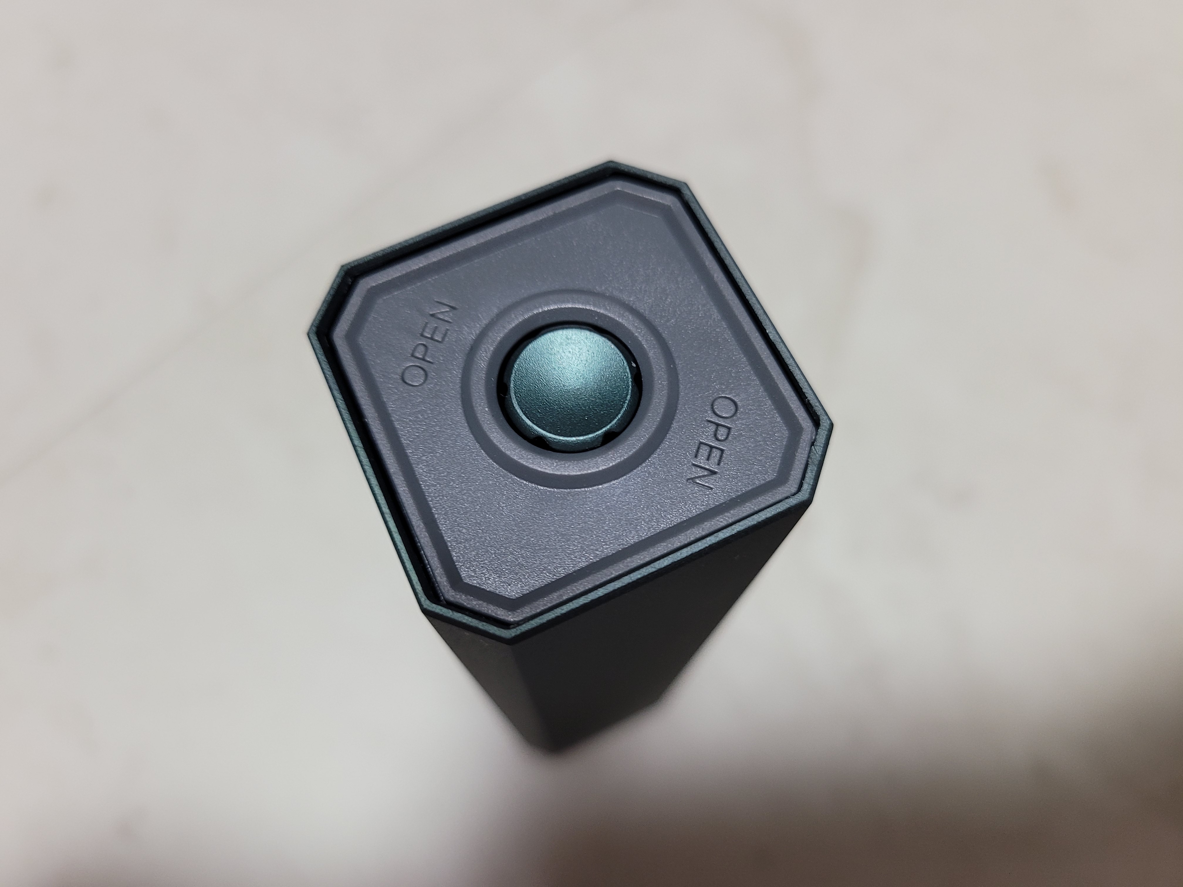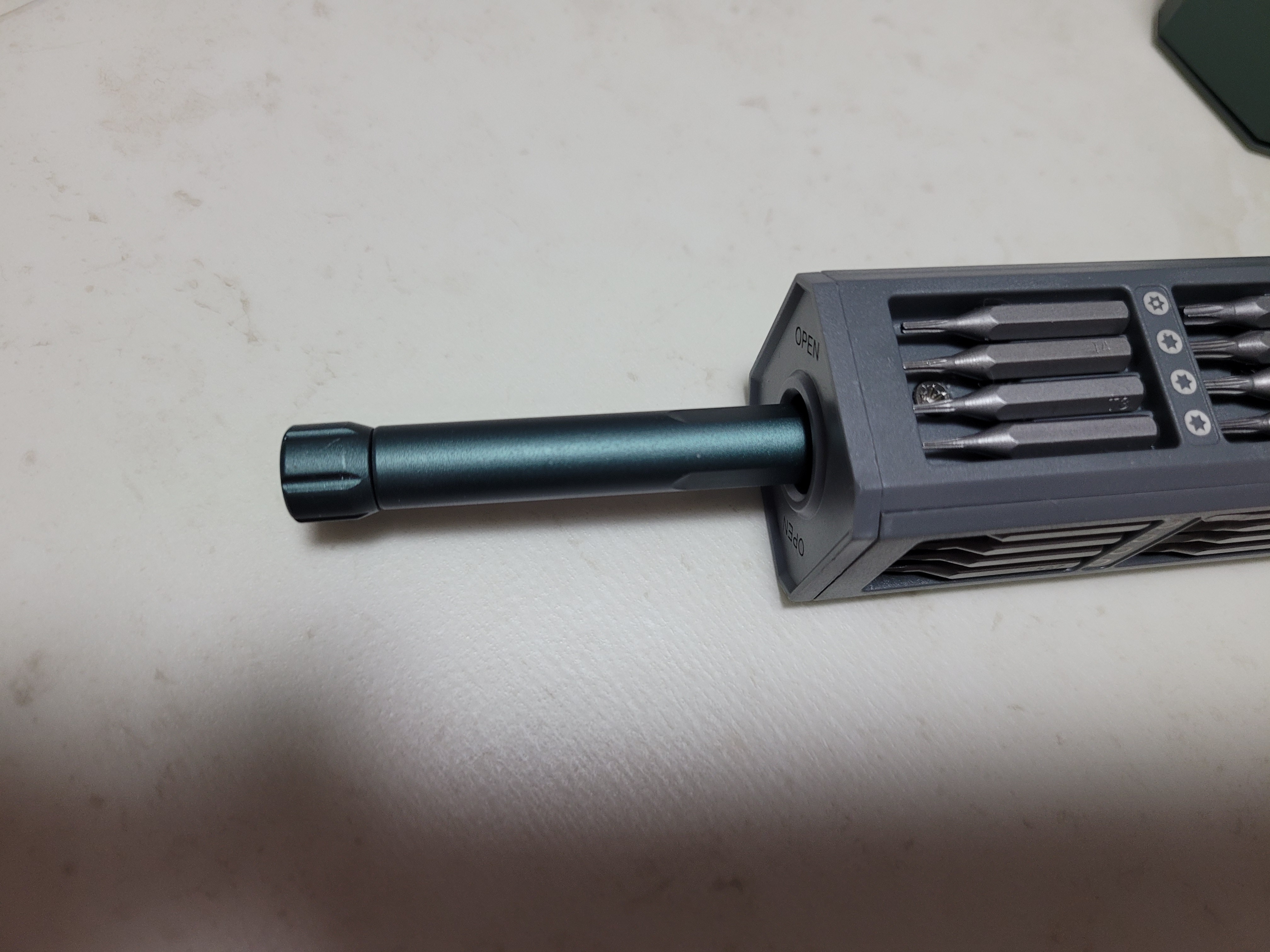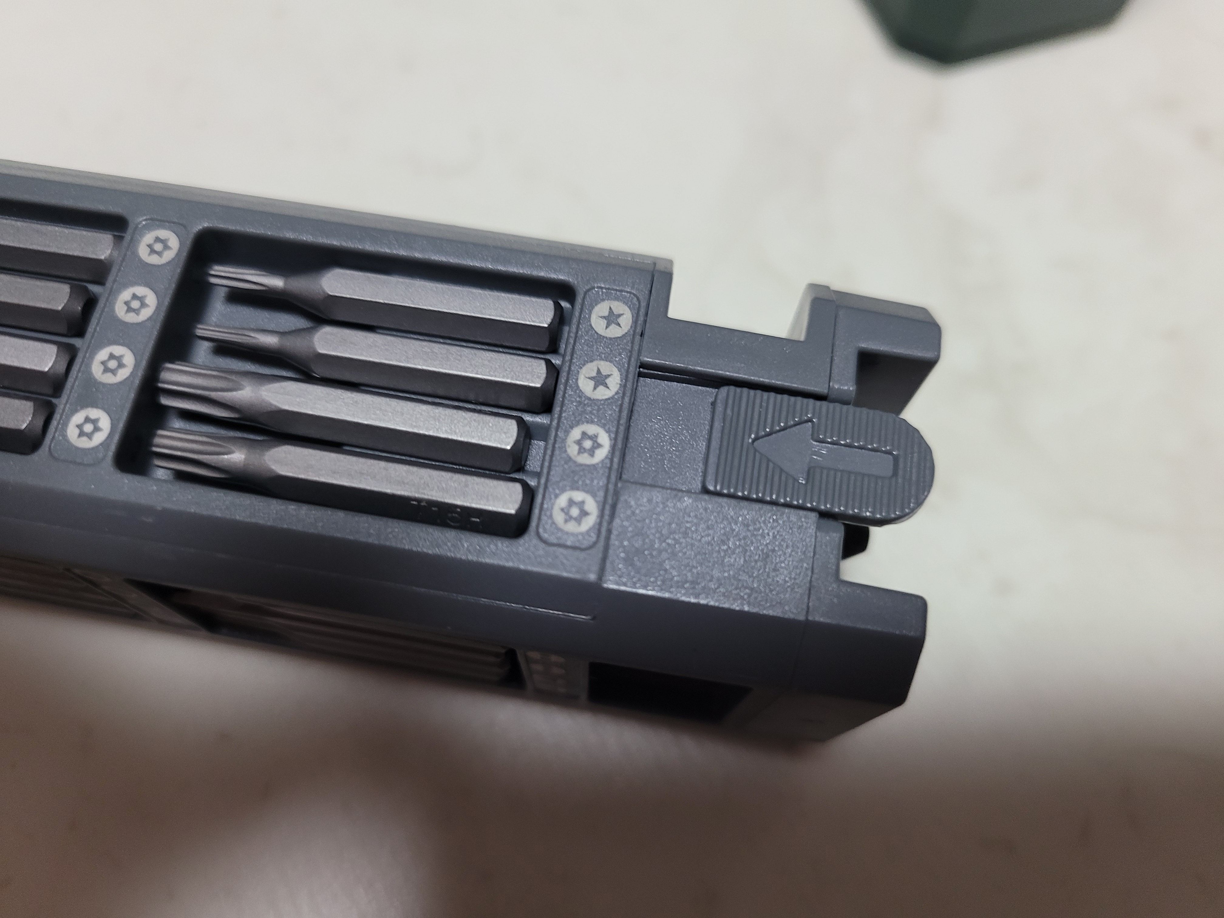 제품을 위로 세우면 초록색 버튼 같이 생겼는데 저거 누르면 절대 안나옵니다. 오른쪽 OPEN이라고 글자 쓰인곳을 누르면 스프링이 올라오면서 제품이 열립니다. 제품을 쭉빼서 맨 밑에 보면 사진같이 화살표가 나와 있는 곳있는데 화살표 방항으로 내리면 아까 위에 버튼 처럼 보였던 드라이브 본체가 쏙하고 나옵니다. 자석으로 되어 있어서 드라이버 해드를 쏙 빼서 연결하면 됩니다 참쉽죠?
