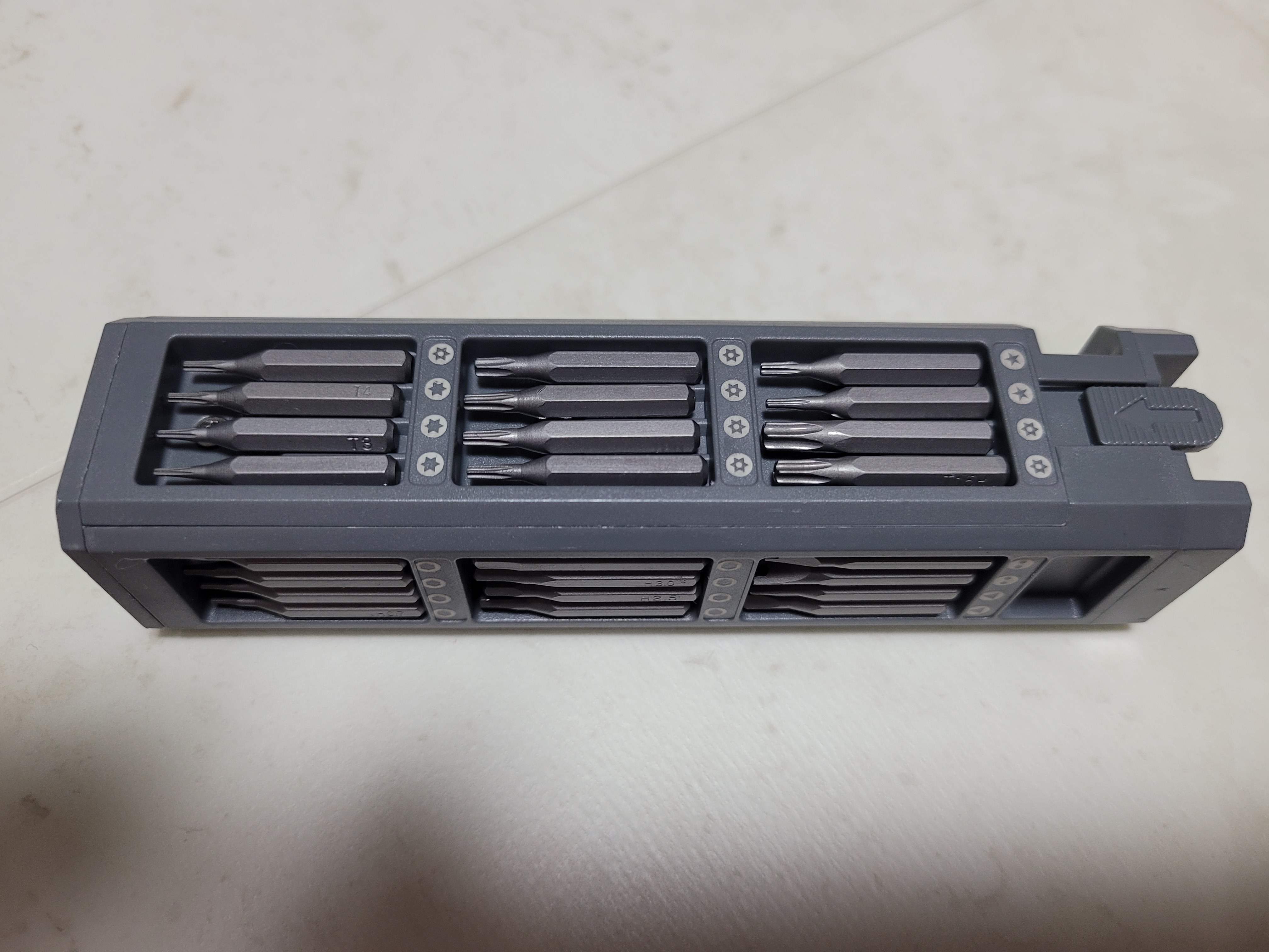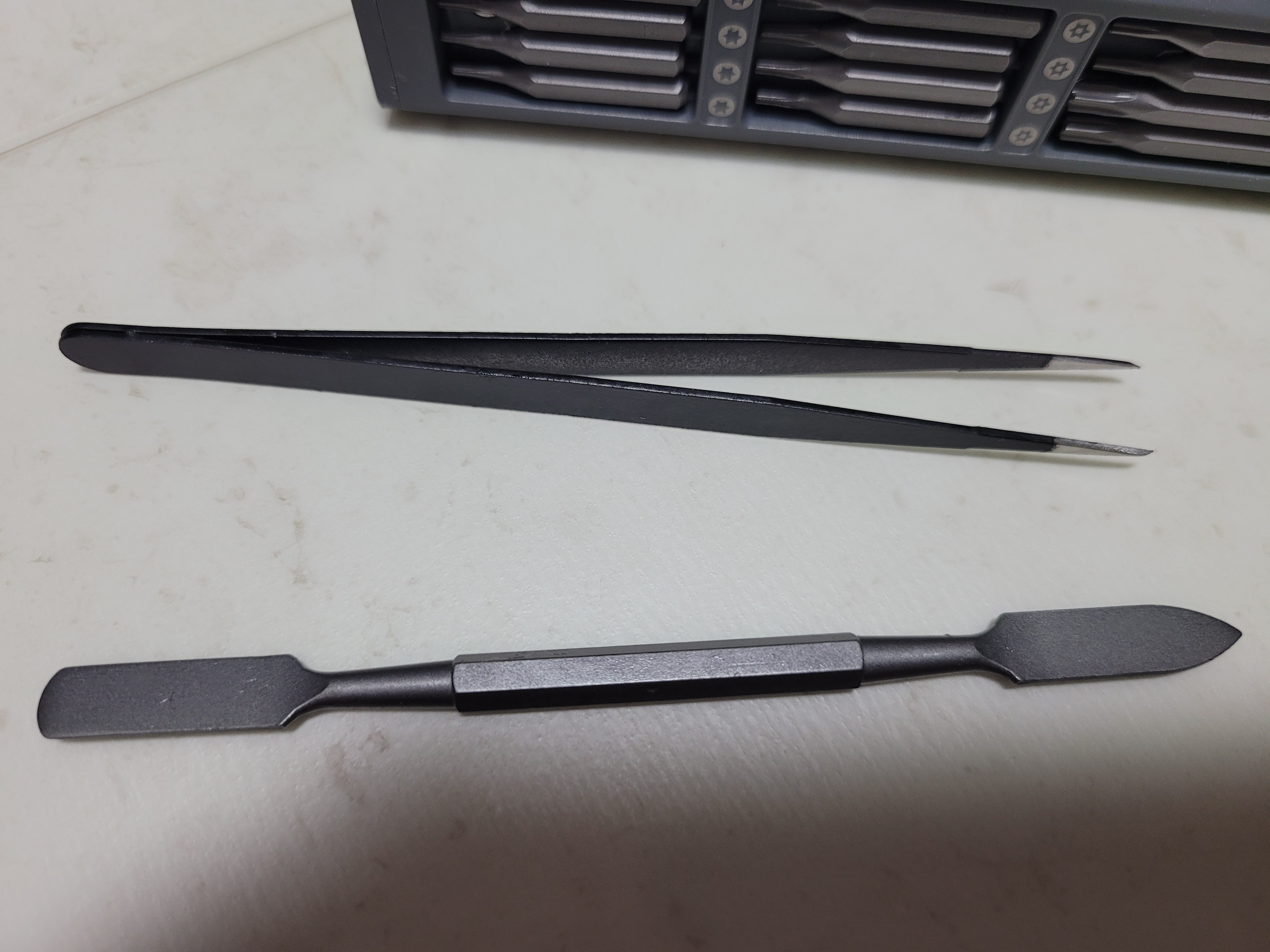 또 한면에는 드라이브 해드 말고도 핀셋 하고 조각칼 같이 생긴게 달려 있느네 이것은 어디에 쓰는지 잘모르겠네요 핀셋은 나사가 잘 안빠지는경우 사용하면 좋을거 같습니다. 둘다 날카롭기 때문에 아이를 대리고 있으신분들은 조심해서 사용하셔야 할거 같네요
