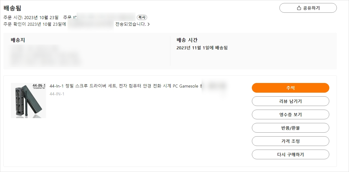 - 구입일자 : 2023.10.23. 저녁 / 배송도착 : 2023.11.01 오후 /총 배송 기간 : 9일
