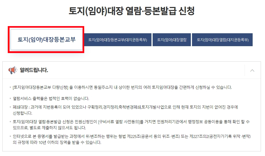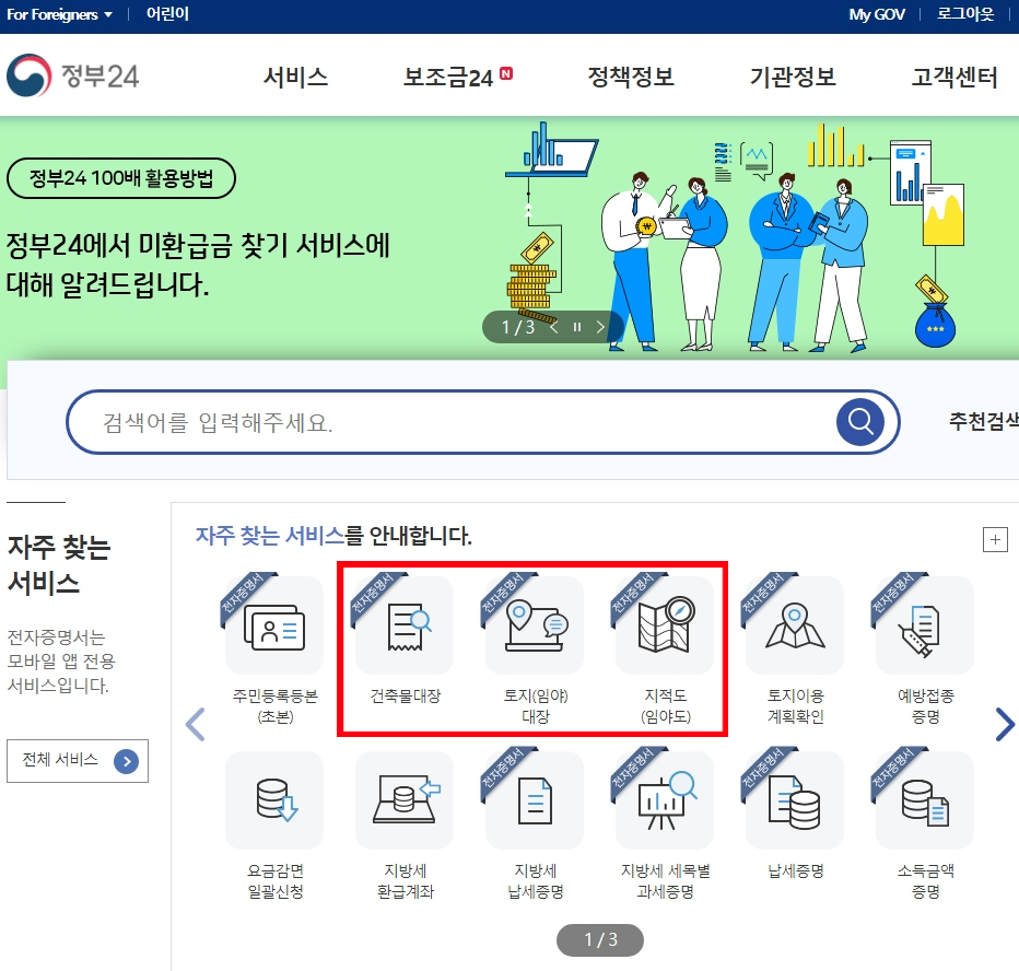 가운데 메뉴에 보면 "자주찾는 서비스"가 있는데 거기에서 "토지(임야)대장" 부분이 있습니다.