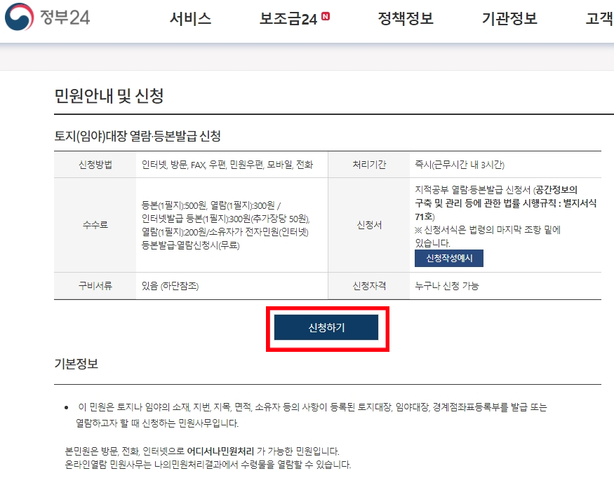 저희가 발급하려고하는 토지대장열람은 비용이 들어가지 않기 때문에 바로 신청하기 누르시면 됩니다.