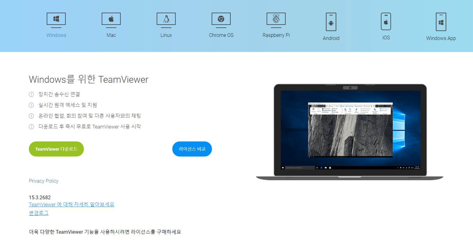 팀뷰어 다운로드 페이지에 보면 원도우,맥,리눅스등 다양한 os에 맞게 서칠할수 있다록 프로그램이 개발이 되어있어 어느 환경에서도 사용이 가능합니다.