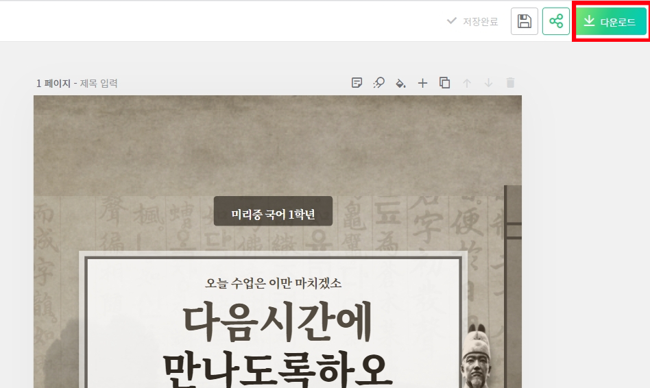 수정이 다 끝내면 현재 아이디에 수정했던 자료를 그대로 저장하기 위해서는 디스크 모양 클릭하면 저장이 되며, 다운로드하여 사용하고 싶은 경우에는 오른쪽 상단에 다운로드 클릭하면됩니다.