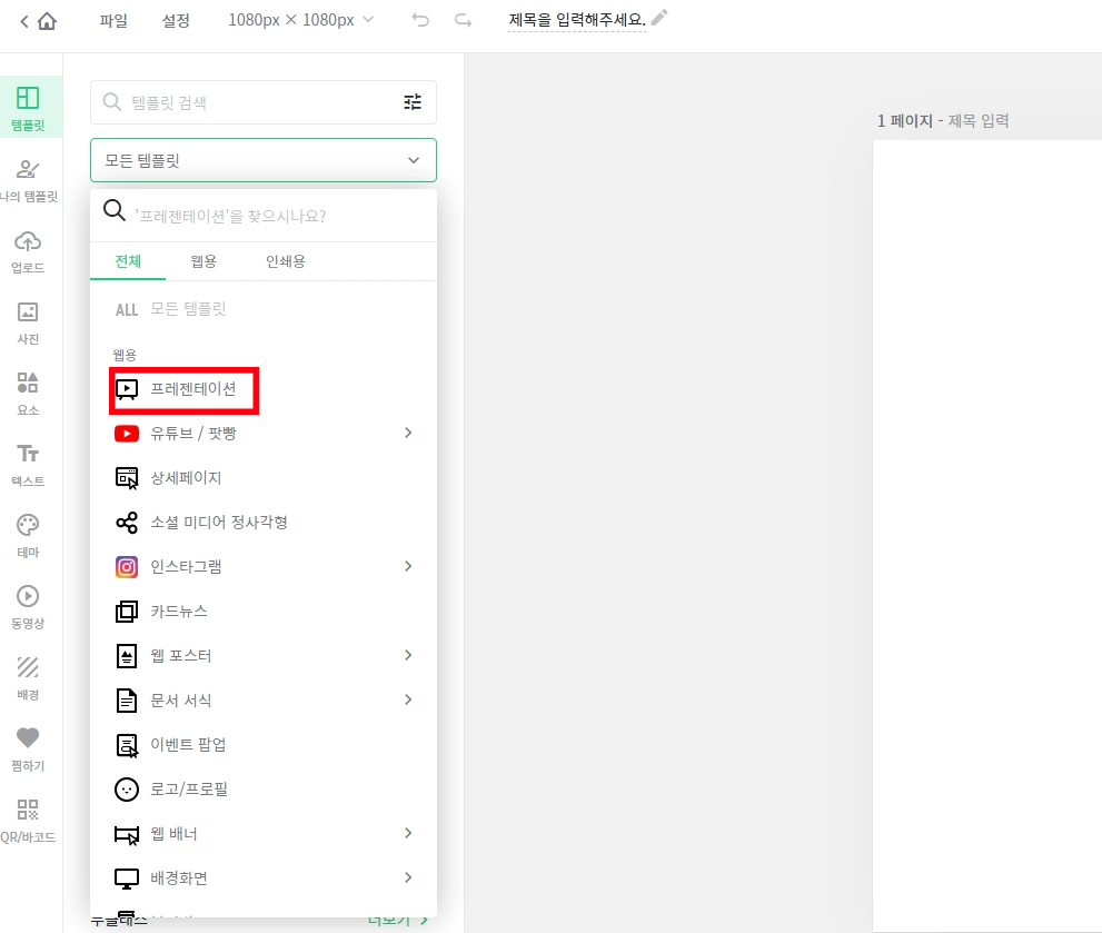 프레젠테이션 클릭하면, "과제/발표, 교육, 회사/기업, 포트폴리오"등으로 나눠져 있습니다.
