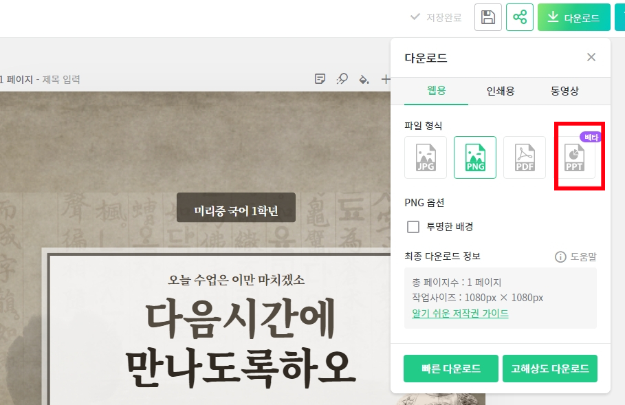 우리가 원하는 ppt 템플릿으로 사용하기 위해서는 ppt로 저장하기 누르시면 끝납니다. 용도에 따라 pdf, jpg, png로 저장이 가능합니다.
