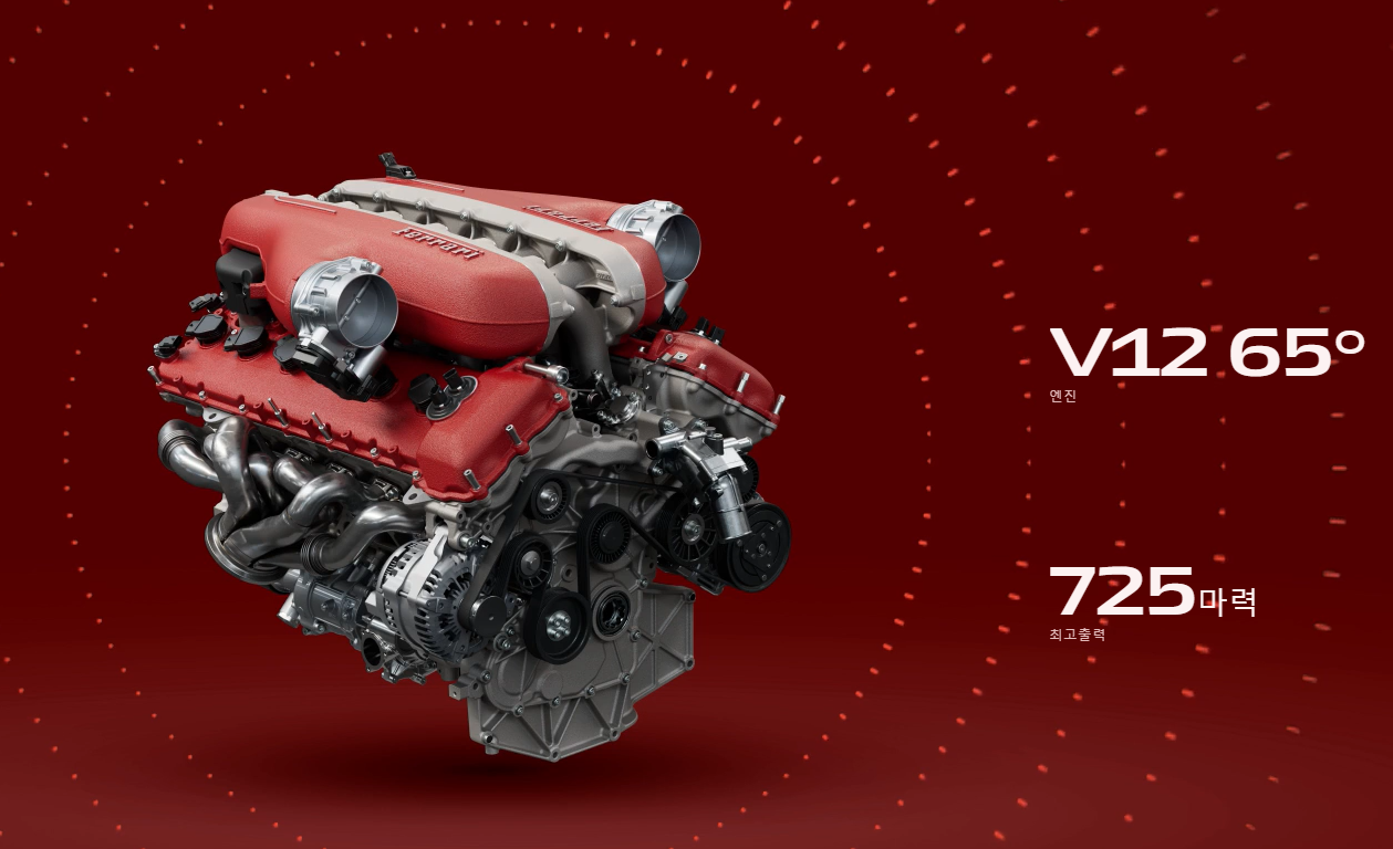 프론트 미드십과 비슷한 비율을 가진 유일한 차량으로 완전히 새로운 배열로 재탄생한 페라리의 상징적인 V12엔진은 세그먼트내 가장 강력한 725cv를 발휘하면서도 매력정인 엔진사운드를 보장합니다.