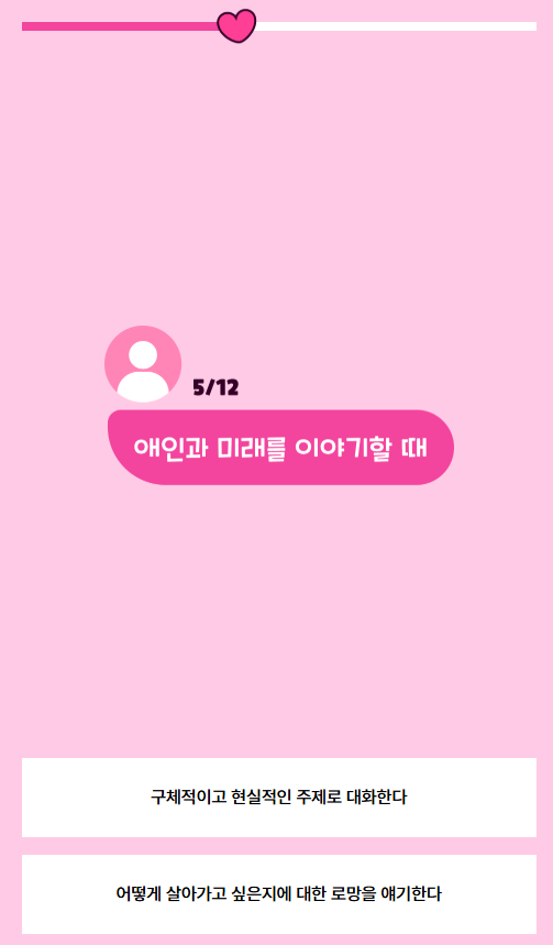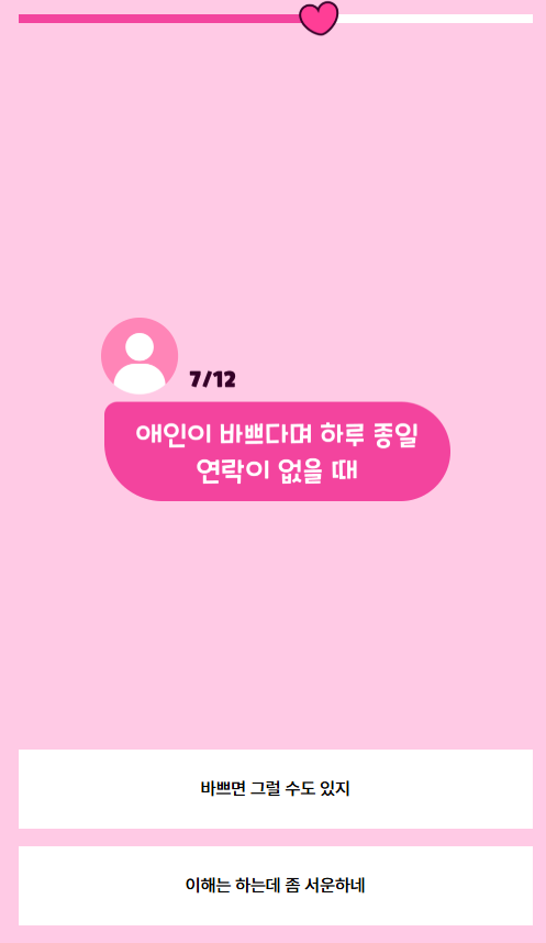 해당 질문에 따라 결과치가 다르게 나오기 때문에 자신의 연애 유형이 정말로 궁금하시다면, 솔직하게 하나씩 답변하는 것을 추천드립니다. 저도 제 유형이 매우 궁금해서 하나씩 진지하게 작성하였습니다.