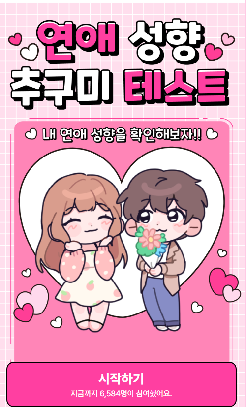 먼저 푸망 연애 성향 추구미 테스트에 접속해야 합니다. 벌써 많은 사람들이 참여한 것을 확인할 수 있습니다. 그럼 시작하기를 누르고 진행합니다.