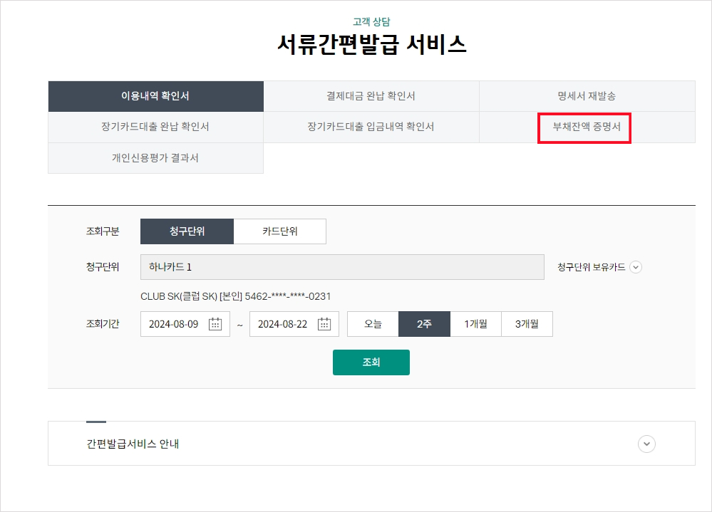 2. 하나카드 부채 잔액 확인서 발급방법 자세히 정리