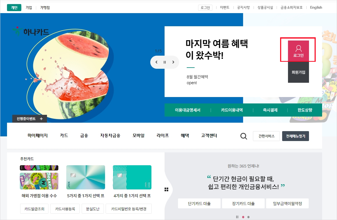 1) 하나카드 홈페이지 접속 및 로그인