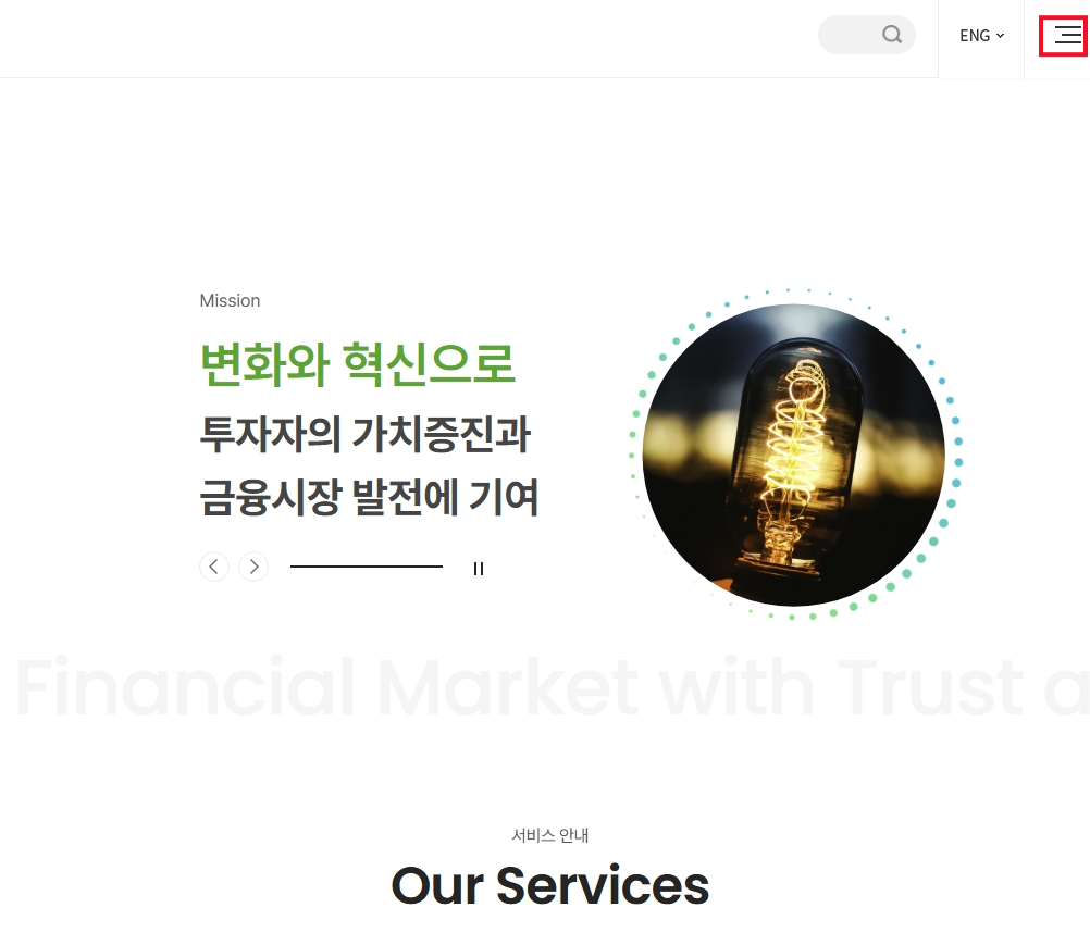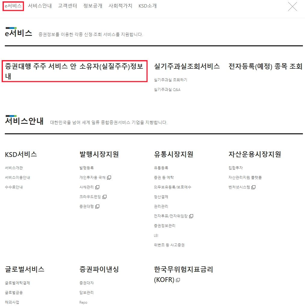 먼저 한국예탁결제원 홈페이지를 찾아 들어갑니다. 찾기 어려우신 분들은 아래 링크를 통하여 바로 이동이 가능합니다. 홈페이지 이동후에 오른쪽상단에 3선을 클릭하시면 바로 "e서비스" 카테고리에서 "증권대행 주주 서비스 안내 소유자(실질주주)정보"를 클릭해주세요.