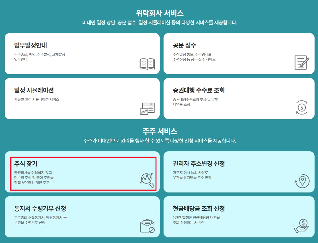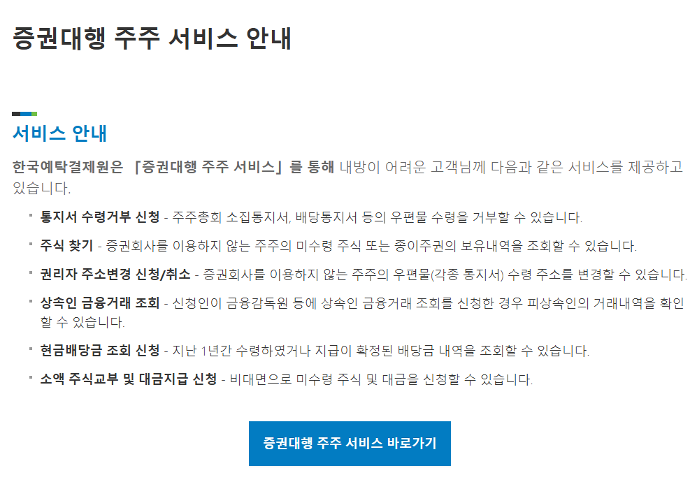 증권대행 주주 서비스는 "통지서 수령거부 신청, 주식찾기, 권리자 주소변경 신청/취소, 상속인 금융거래 조회, 현금배당금 조회 신청, 소액 주식교부 및 대금지급 신청" 등에 서비스를 이용할수 있습니다. 증권 대행 주주 서비스로 바로가기를 클릭하시면 우리가 원하는 메뉴인 "주식찾기" 메뉴가 나오는데 해당 메뉴를 클릭하시면 됩니다.